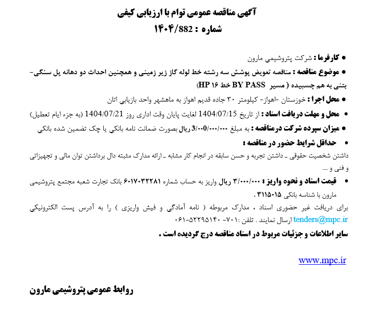 برای دریافت غیر حضوری اسناد , مدارک مربوطه ( نامه آمادگی و فیش واریزی ) را به آدرس پست الکترونیکی tenders@mpc.ir ارسال نمایند . تلفن :701- 52295140-061