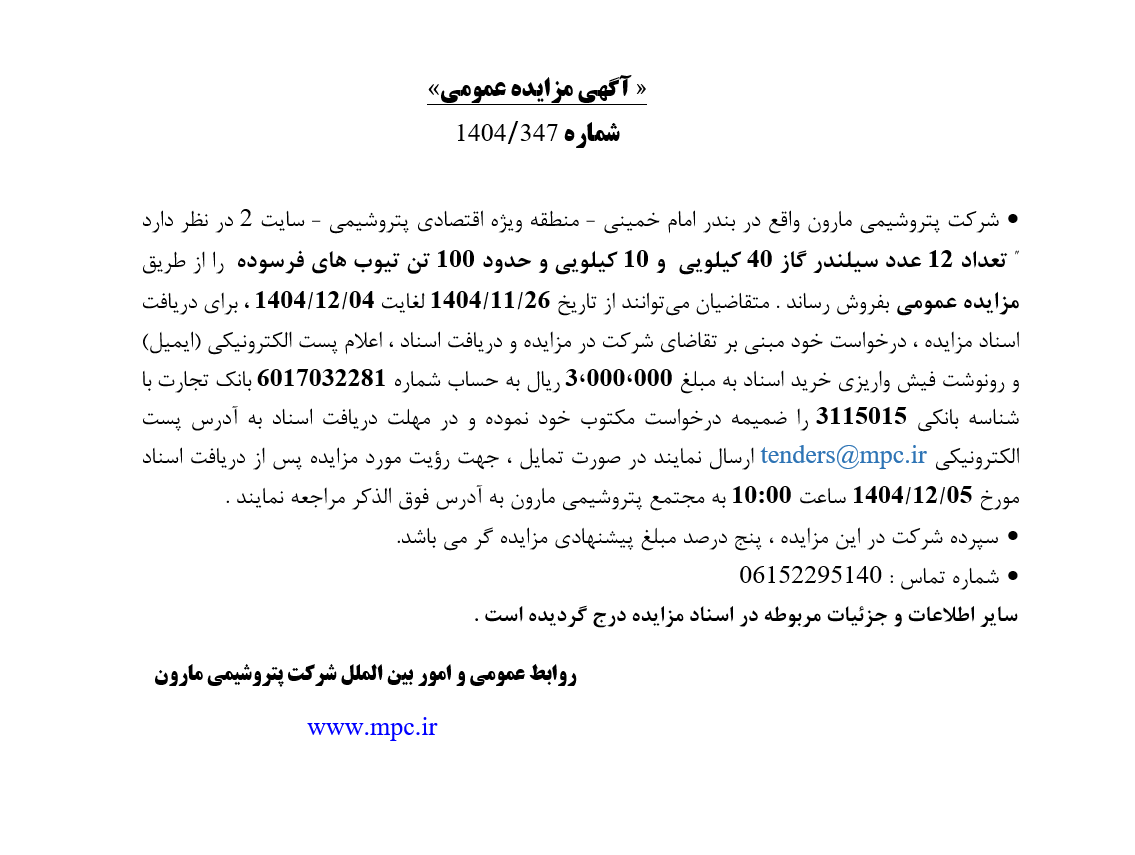 برای دریافت اسناد , مدارک مربوطه ( نامه آمادگی و فیش واریزی ) را به آدرس پست الکترونیکی tenders@mpc.ir ارسال نمایند . تماس : 52295140-061