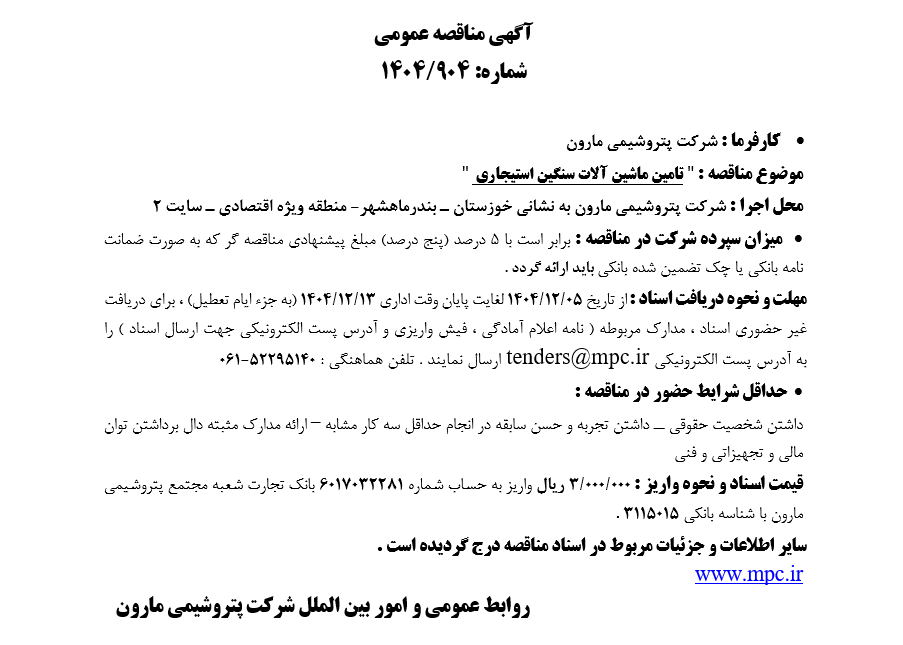 مدارک مربوطه ( نامه آمادگی و فیش واریزی ) را به آدرس پست الکترونیکی tenders@mpc.ir ارسال نمایند