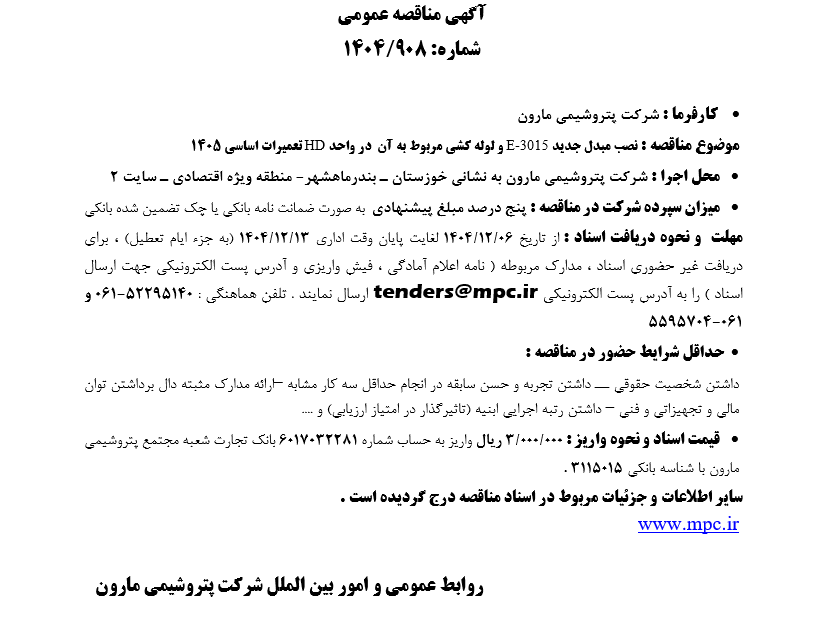 مدارک مربوطه ( نامه اعلام آمادگی ، فیش واریزی و آدرس پست الکترونیکی جهت ارسال اسناد ) را به آدرس پست الکترونیکی tenders@mpc.ir ارسال نمایند .